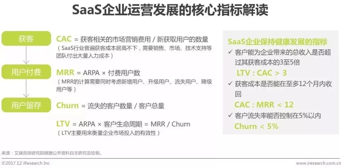目前行业内普遍的观点认为,LTV在CAC的3-5倍以上,获客成本能够在12个月内收回(即CAC小于12倍的MRR),客户流失率控制在一定范围以内(欧美主流观点认为流失率应在5%以内,但在国内受国情影响极难达成),是一个SaaS厂商持续健康发展的关键性指标。当然,由于企业在具体经营发展中存在业务模式、客户特征、市场竞争态势等诸方面的差异,并不建议一味死磕上述标准。