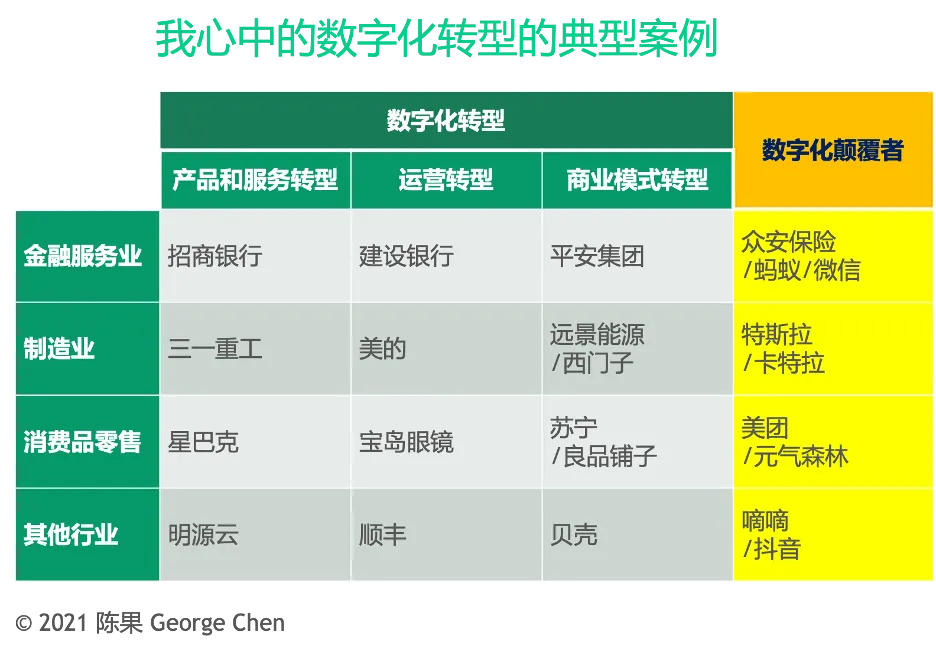 在研究了大家熟悉的行业和企业,我列出我认为真正属于数字化转型的案例。以下仅简要介绍该企业符合三类转型中该类转型的主要特点,详细情况大家可以在网上自己研究。