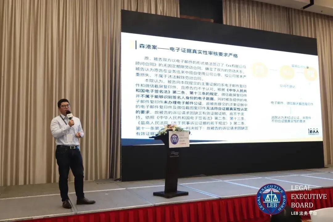 法大大法律事业部副总经理张霖就“企业数字化转型”为题结合实际案例做的分享。张总通过四个案例分析了传统企业常见败诉原因,包括纸质劳动合同易丢失、难以证明电子签章公司资质合规、电子证据真实性审核要求严格和难以证明证据生成时未被篡改等。