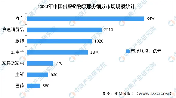 我国供应链物流服务主要集中在汽车、快速消费品、服饰、3C电子、生鲜等领域。其中,消费电子、汽车的供应链服务需求大,2020年,汽车、快速消费品市场规模分别达3470亿元、2210亿元,其次是服饰和3C电子领域,市场规模分别为1920亿元、1800亿元。
