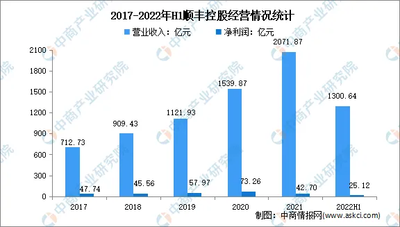 顺丰控股是是国内领先的综合物流服务商、全球第四大快递公司。经过多年发展,顺丰搭建了完整的一体化综合物流服务体系,为客户提供贯穿采购、生产、流通、销售、售后的一体化供应链解决方案。2021年,顺丰控股营业收入达2071.87亿元,净利润达42.7亿元。2022年1-6月,顺丰控股实现营业收入1300.64亿元,净利润达25.12亿元。