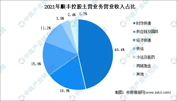 从主营业务来看,2021年顺丰控股主营时效快递、供应链及国际、经济快递、快运、冷运及医药、同城急送,营业收入分别为961.6亿元、392亿元、322.7亿元、232.5亿元、78亿元、50亿元,占主营业务收入的比重分别为为46.4%、18.9%、15.6%、11.2%、3.8%、2.4%。