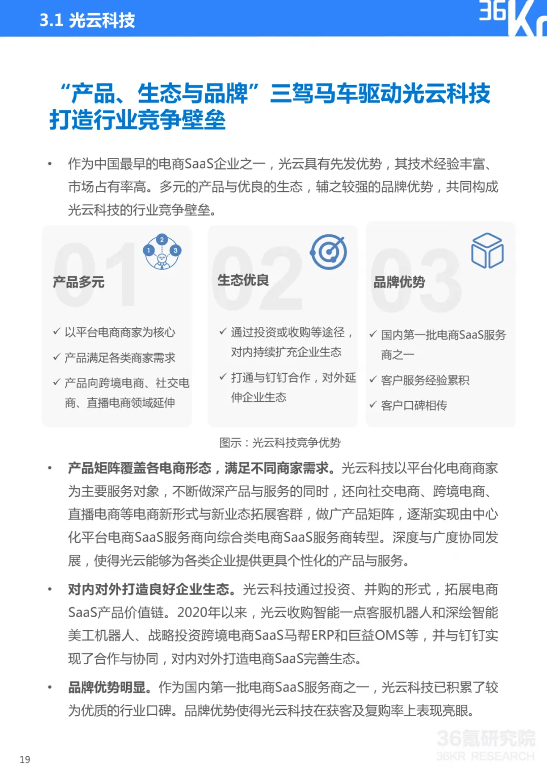 报告肯定了光云科技的行业地位。报告强调,作为中国最早的电商SaaS企业之一,光云具有先发优势,其技术经验丰富、市场占有率高。多元的产品与优良的生态,辅之较强的品牌优势,共同构成光云科技的行业竞争壁垒。