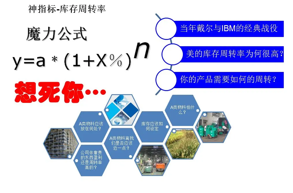 众所周知,这是银行利息复利的计算公式,如果a和x一定,那么n越大则y值越大。对应到制造业供应链就体现为库存周转率(ITO),库存周转率=使用数量(金额)/平均库存(金额)。如果库存周转率越大,相当于以上公式中的n值越大,就意味着企业周转更快,供应链上的价值流动更快,从而使企业能够创造更大的价值。