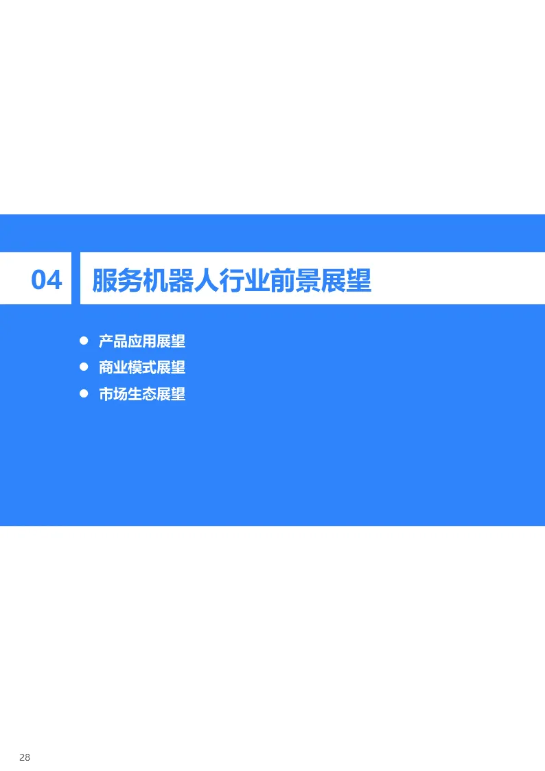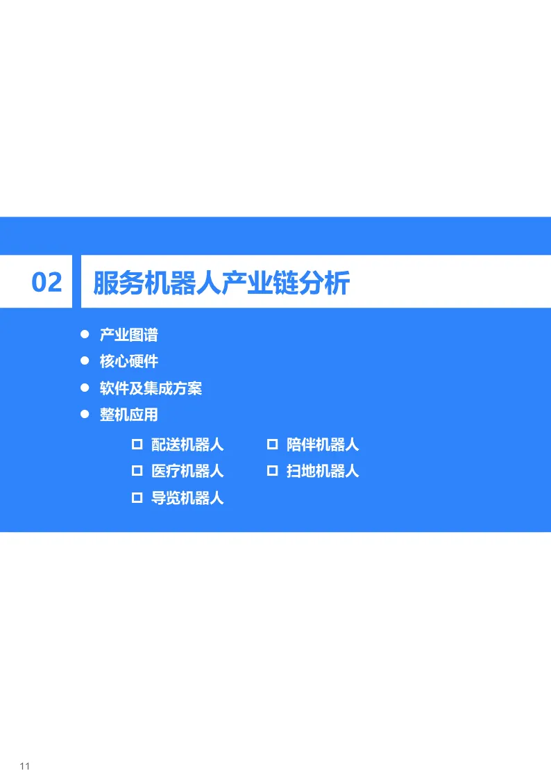 随着服务机器人智能化、个性化水平快速提升,其应用领域也在不断扩展。目前,具备引导接待、配送、消杀等功能的商用服务机器人已经在博物馆、美术馆、展厅、酒店、餐厅、写字楼、学校、工业园区等室内外场景实现规模化落地应用。同时,陪伴、清洁等家用机器人渗透率也在稳步提升。此外,手术机器人和医疗康复机器人因存在较高技术壁垒,开放道路无人配送机器人因政策和技术成熟度限制,这几类服务机器人目前落地应用有限,但是发展前景未来可期。