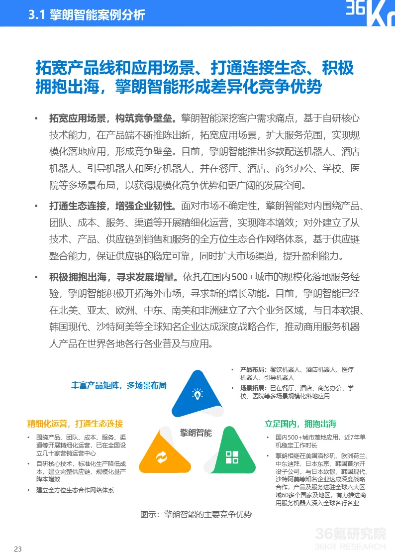 当前,服务机器人领域的主流玩家已实现万台级的落地部署量,部分服务机器人产品在使用场景上已经日趋成熟和稳定。在这一趋势下,服务机器人行业的竞争焦点也由单一技术竞赛转变为对产品落地和良性商业模式的追求。一方面,经过市场验证的产品应用能够有利推动商业模式成熟和商业闭环构建;另一方面,只有依靠规模化落地应用和健康现金流,企业才能实现良性增长。