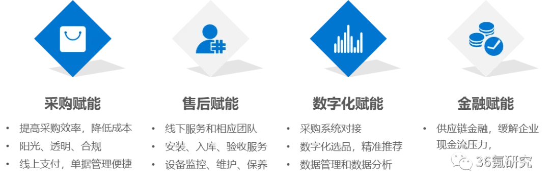 图示:工业品B2B对供应商的赋能价值对于产业链下游的采购企业来说,主要面临产品价格不透明、采购效率低下、SKU管理成本高、需求响应慢等工业品采购痛点。工业品B2B的价值主要体现在采购赋能、售后赋能、数字化赋能、金融赋能四个方面。