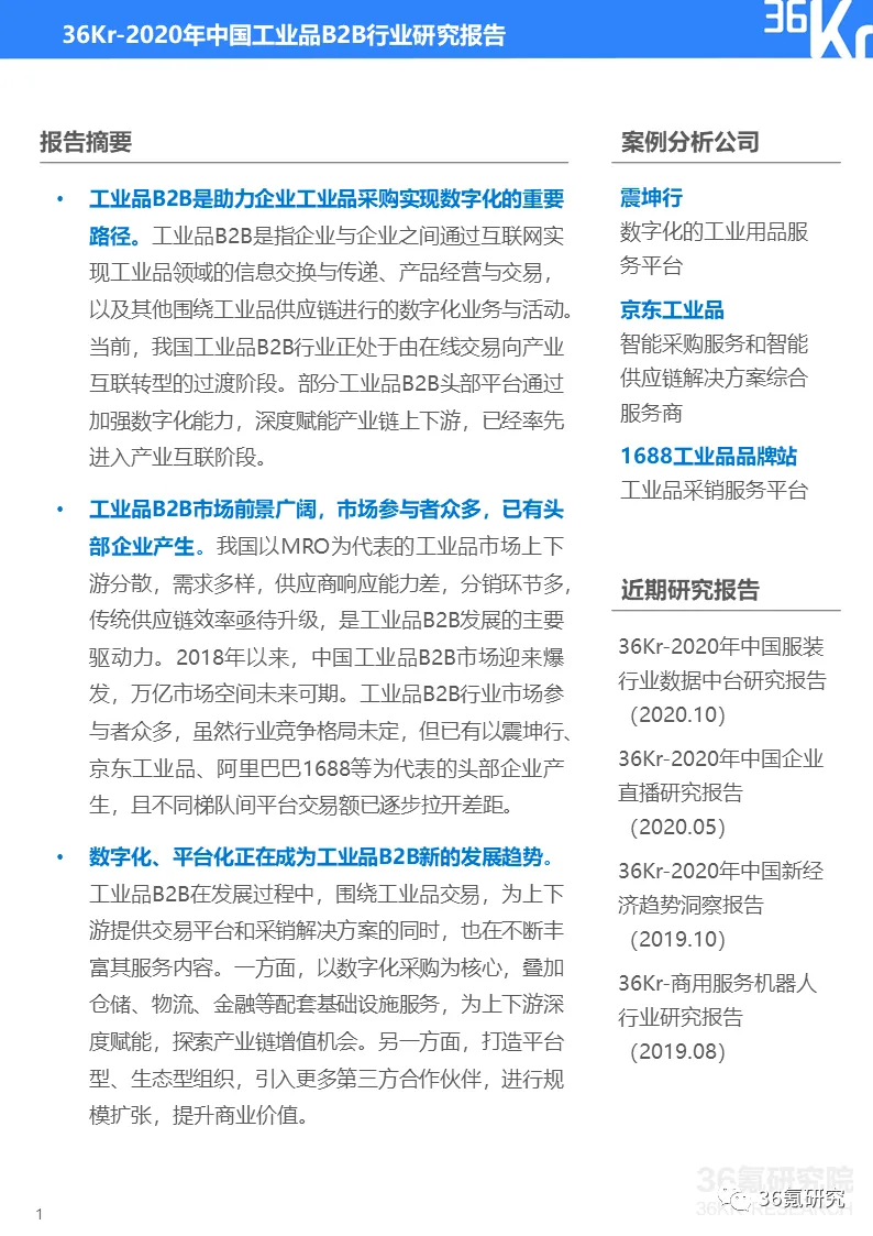 2020年中国工业品B2B行业研究报告 | 36氪研究院