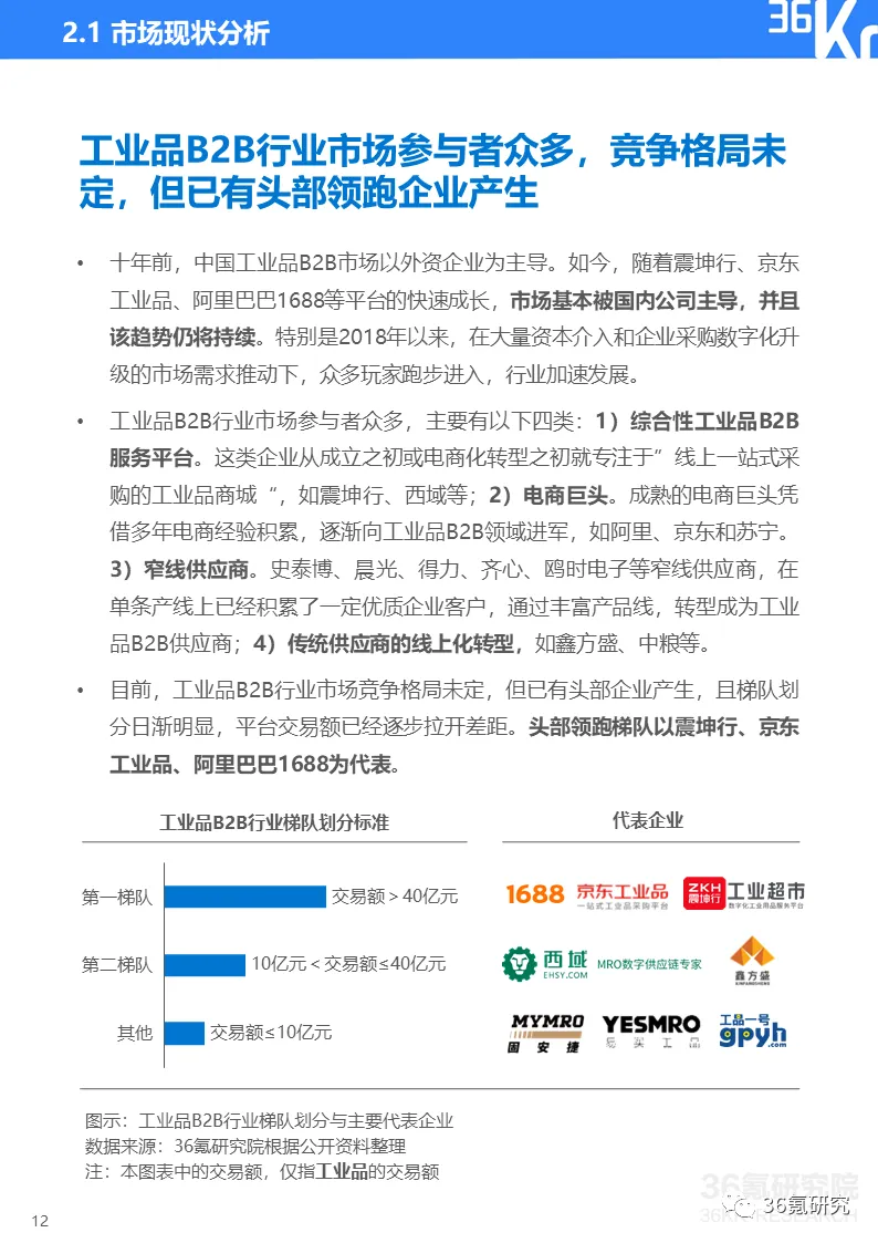 图示:工业品B2B对采购企业的赋能价值工业品B2B市场前景广阔,市场参与者众多,已有头部企业产生根据36氪研究院测算,2018年中国工业品B2B市场规模约为1,220亿元,线上渗透率约为1%。未来五年工业品B2B市场规模将持续增长,年复合增长率约为53.1%。预计到2023年市场规模将达万亿元,渗透率有望持续提升,市场前景广阔。工业品B2B行业市场参与者众多,虽然行业竞争格局未定,但已有以震坤行、京东工业品、阿里巴巴1688等为代表的第一梯队头部企业产生,且不同梯队间平台交易额已逐步拉开差距。工业品B2B在发展过程中,围绕工业品交易,为上下游提供交易平台和采销解决方案的同时,也在不断丰富其服务内容。一方面,以数字化采购为核心,叠加仓储、物流、金融等配套基础设施服务,为上下游深度赋能,探索产业链增值机会。另一方面,打造平台型、生态型组织,引入更多第三方合作伙伴,进行规模扩张,提升商业价值。· 怎样理解工业品B2B?工业品B2B行业历经怎样的发展过程?· 工业品B2B行业的市场现状如何,有怎样的发展趋势?· 工业品B2B行业的产业链是怎样的,核心环节是什么?· 工业品B2B平台主要有哪些经营模式?哪种模式更具优势?更多精彩内容,详见《2020年中国工业品B2B行业研究报告》,点击文章底部【阅读原文】,提取码:3end