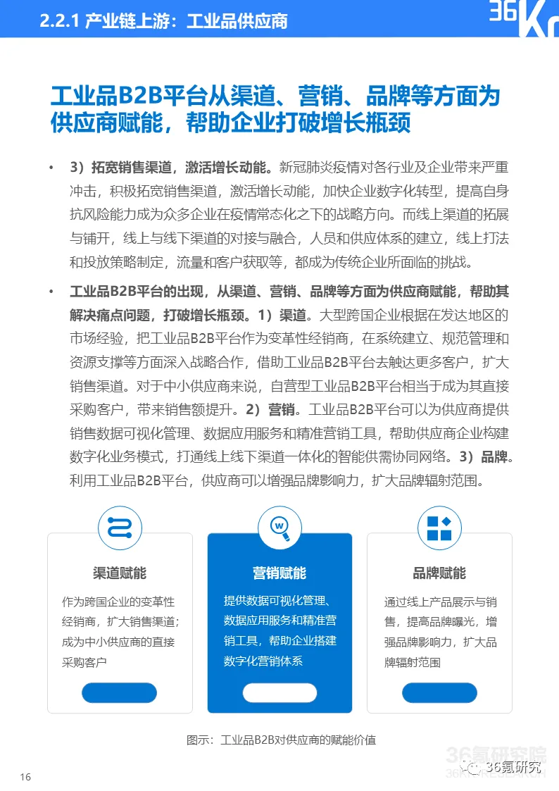 2018年以来,随着2C端互联网流量红利消失,2B端产业互联网迎来发展春天。作为B2B领域的核心赛道,工业品B2B行业拥有万亿级市场规模。虽然市场参与者众多,竞争格局未定,但行业发展二八效应明显,已有以震坤行、京东工业品、阿里巴巴1688等为代表的第一梯队头部企业产生。2020年,行业头部玩家实力凸显,震坤行和京东工业品等持续获得资本支持,大额融资频现,业务得到快速发展的同时,对整个市场格局变化也带来深远影响。长期以来,我国以MRO为代表的工业品市场存在上下游分散,需求多样,供应商响应能力差,分销环节多等痛点,传统供应链效率亟待升级。在企业数字化转型的大背景下,用数字化手段提高采购效率,成为企业的共同需求,工业品B2B则成为助力企业实现工业品采购数字化的重要路径之一。工业品B2B是指企业与企业之间通过互联网实现工业品领域的信息交换与传递、产品经营与交易,以及其他围绕工业品供应链进行的数字化业务与活动。当前,我国工业品B2B行业正处于由在线交易向产业互联转型的过渡阶段。部分工业品B2B头部平台通过加强数字化能力,深度赋能产业链上下游,已经率先进入产业互联阶段。工业品B2B的价值主要体现在对产业链上下游的赋能作用对于产业链上游的供应商企业来说,主要存在信息不对称,对市场变化反应滞后;行业不规范,难以标准化;销售渠道受阻,增长动能亟待激活等痛点。工业品B2B平台的出现,可以从渠道、营销、品牌等方面为供应商赋能,帮助其解决痛点问题,打破增长瓶颈。