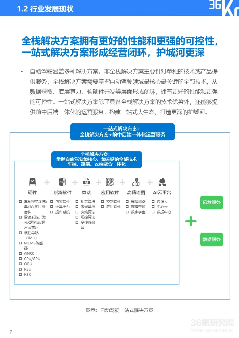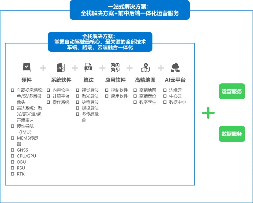 自动驾驶涵盖多种解决方案。非全栈解决方案主要针对单独的技术或产品提供服务;全栈解决方案需要全部掌握自动驾驶领域最核心最关键的技术,从数据获取、底层算力、软硬件开发等层面形成闭环,实现车端、路端、云端融合一体化发展,拥有更好的性能和更强的可控性。一站式解决方案除了具备全栈解决方案的技术优势外,还能够提供前中后端一体化的运营服务,构建一站式大生态,打造更深的护城河。