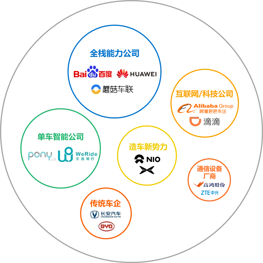 自动驾驶行业主要有通讯设备厂商、传统车企、造车新势力、互联网/科技公司、单车智能公司、全栈能力公司等市场玩家。当前市场竞争格局未定,但是已有头部企业产生,且不同经营路线的梯队间差异日渐明显,一站式解决方案提供商拥有更强的市场竞争力。