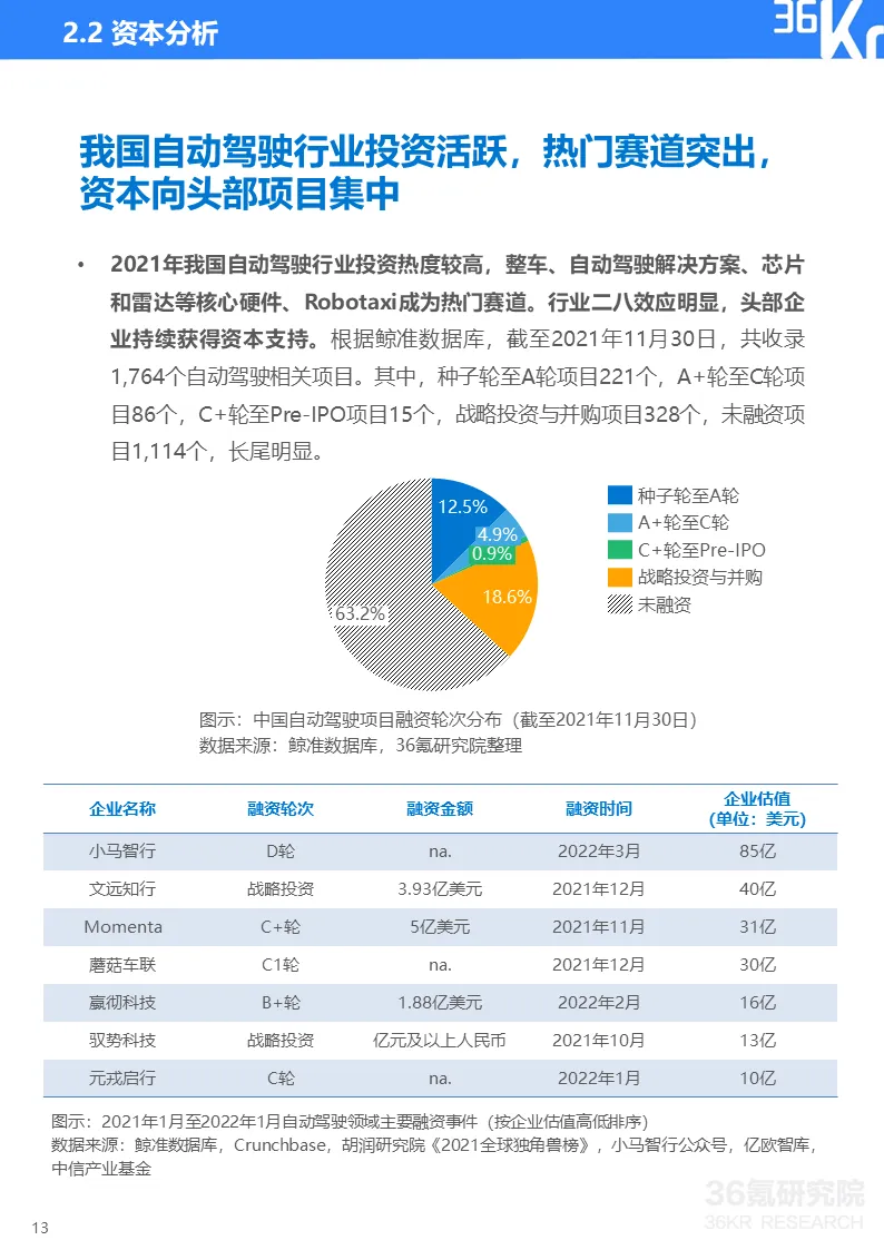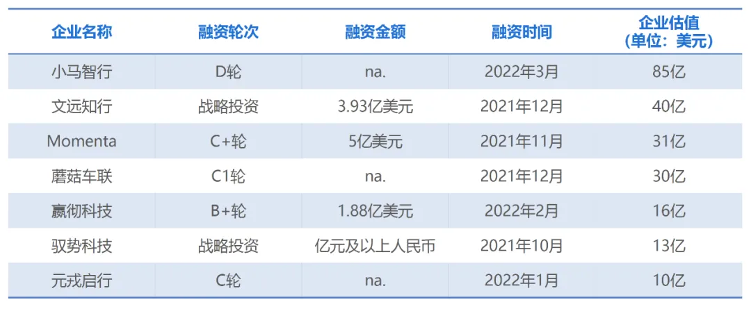 图示:2021年1月至2022年1月自动驾驶领域主要融资事件(按企业估值高低排序)