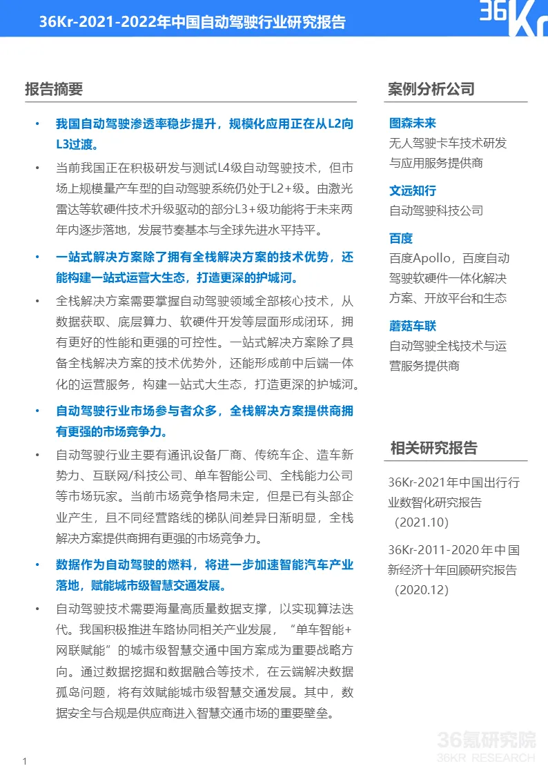 更多精彩内容,请关注“36氪研究”微信公众号。如想获取《2021-2022年中国自动驾驶行业研究报告》,点击文章底部【阅读原文】,提取码:sdd6,或在36氪研究院微信公众号上回复“自动驾驶”获取下载链接。