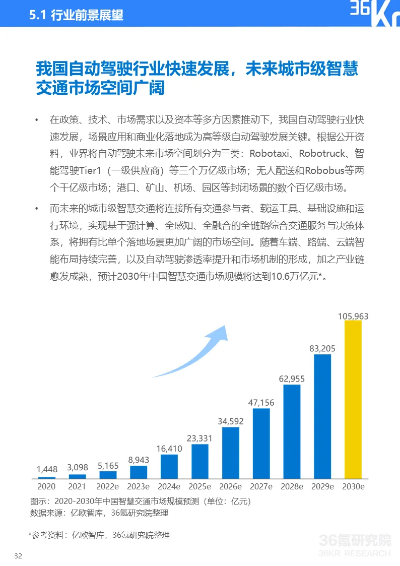 随着车端、路端、云端智能布局持续完善,以及自动驾驶渗透率提升和市场机制的形成,加之产业链愈发成熟,预计2030年中国智慧交通市场规模将达到10.6万亿元。