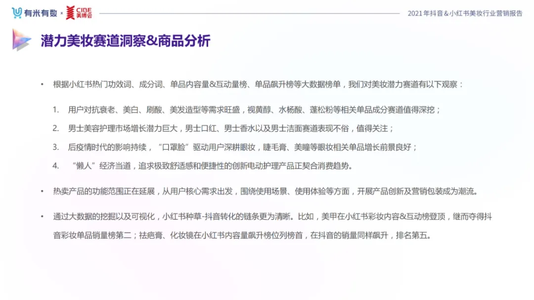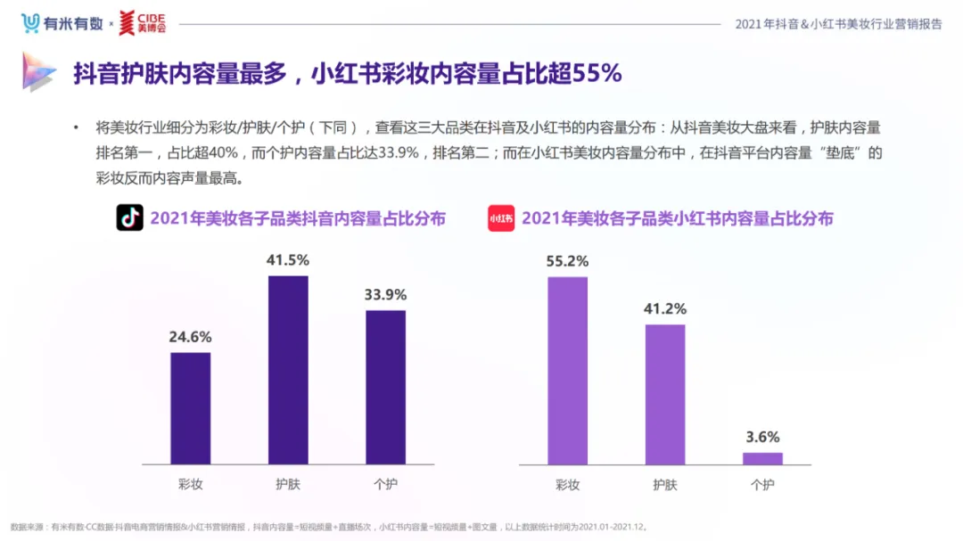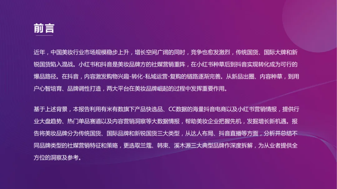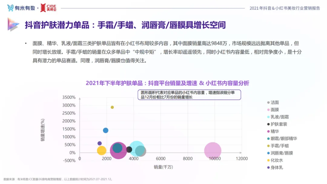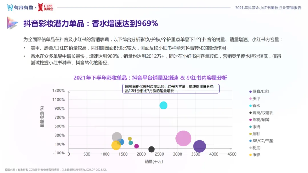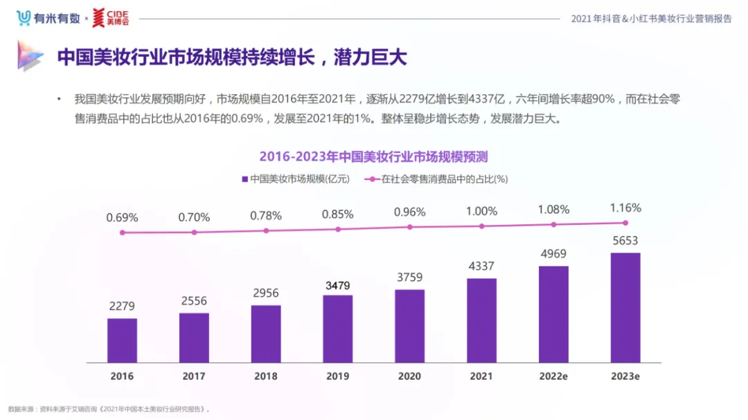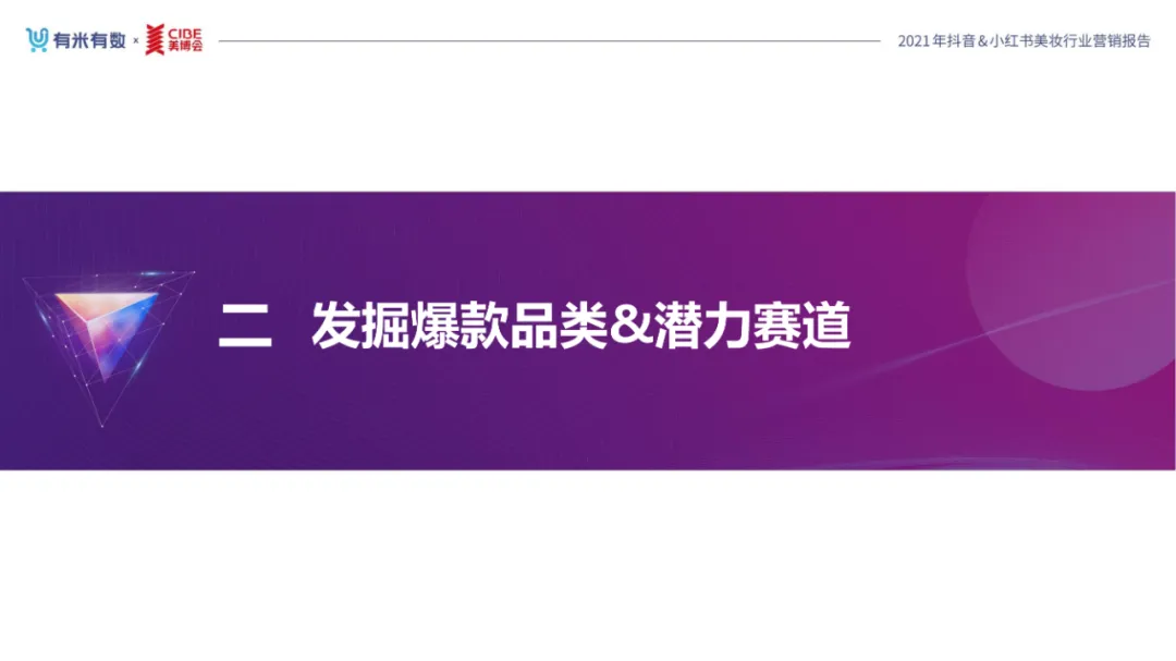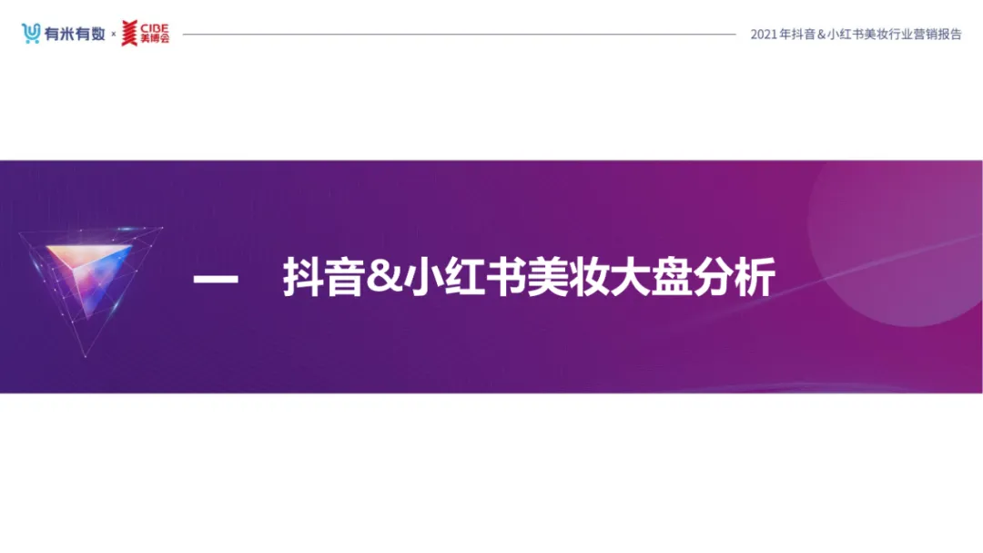 近年,中国美妆行业市场规模稳步上升,增长空间广阔的同时,竞争也愈发激烈,传统国货、国际大牌和新锐国货陷入混战。小红书和抖音是美妆品牌方的社媒营销重阵,在小红书种草后到抖音实现转化成为可行的爆品路径。基于上述背景,有米有数联合中国国际美博会出品《2021抖音&小红书美妆行业营销报告》,利用有米有数旗下产品快选品、CC数据的海量抖音电商以及小红书营销情报,提供行业大盘趋势、热门单品赛道以及内容营销洞察等大数据情报。