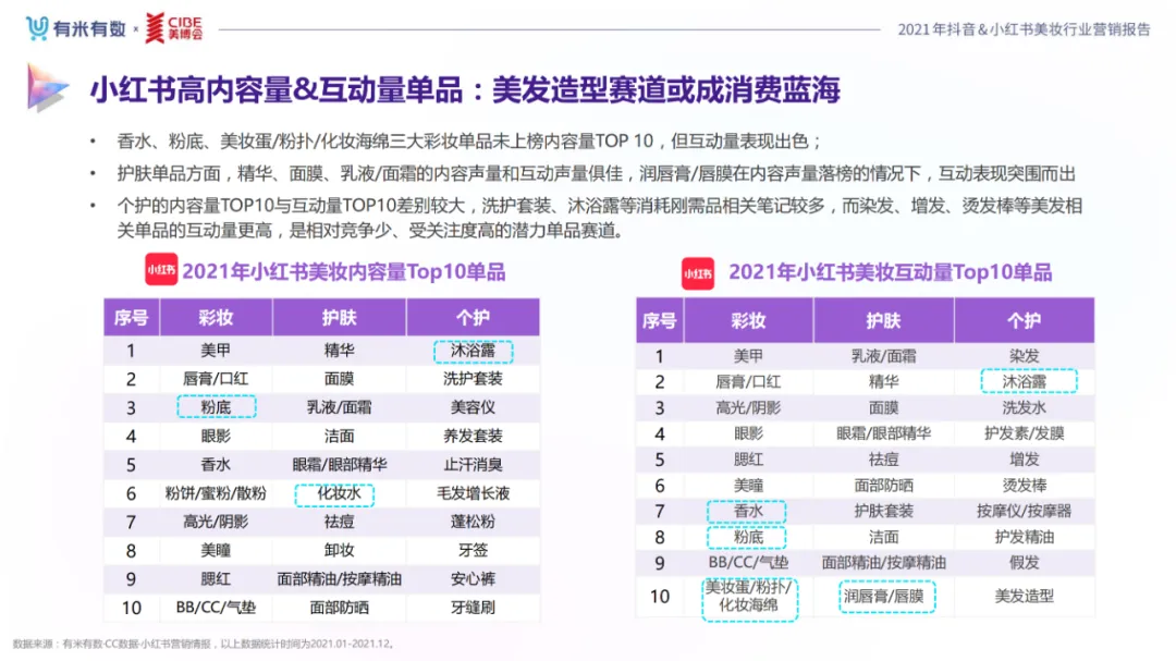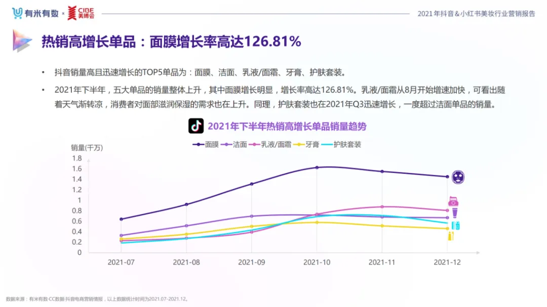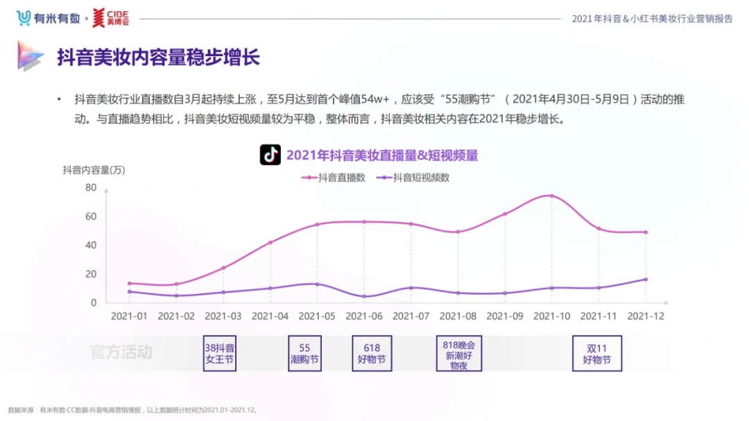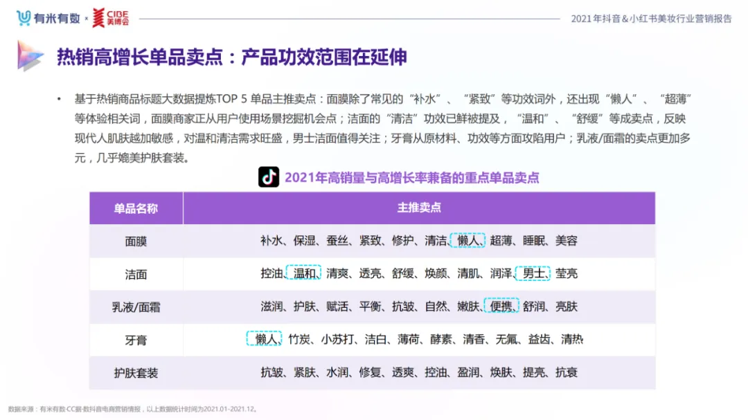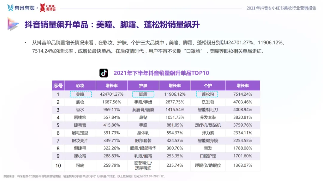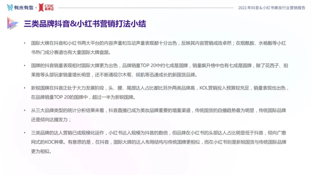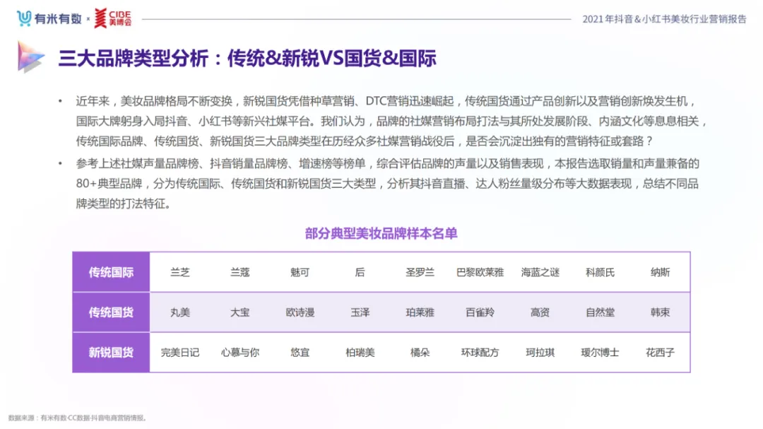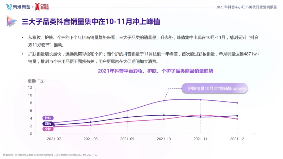 近年,中国美妆行业市场规模稳步上升,增长空间广阔的同时,竞争也愈发激烈,传统国货、国际大牌和新锐国货陷入混战。小红书和抖音是美妆品牌方的社媒营销重阵,在小红书种草后到抖音实现转化成为可行的爆品路径。基于上述背景,有米有数联合中国国际美博会出品《2021抖音&小红书美妆行业营销报告》,利用有米有数旗下产品快选品、CC数据的海量抖音电商以及小红书营销情报,提供行业大盘趋势、热门单品赛道以及内容营销洞察等大数据情报。