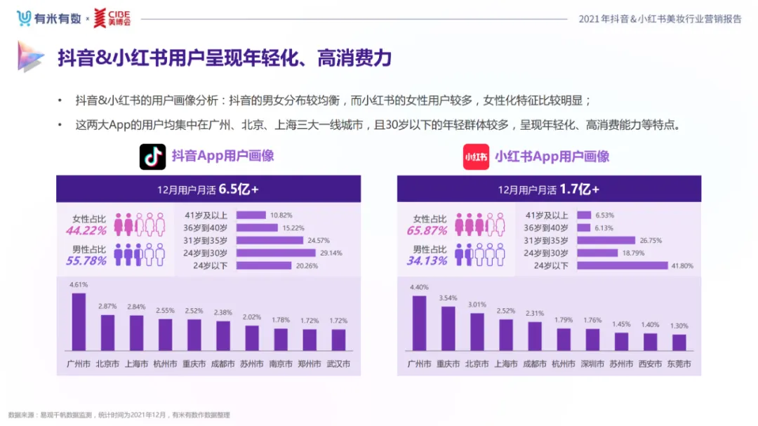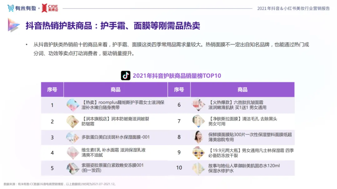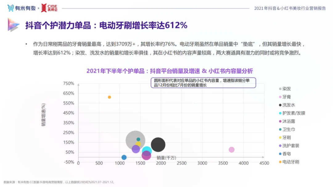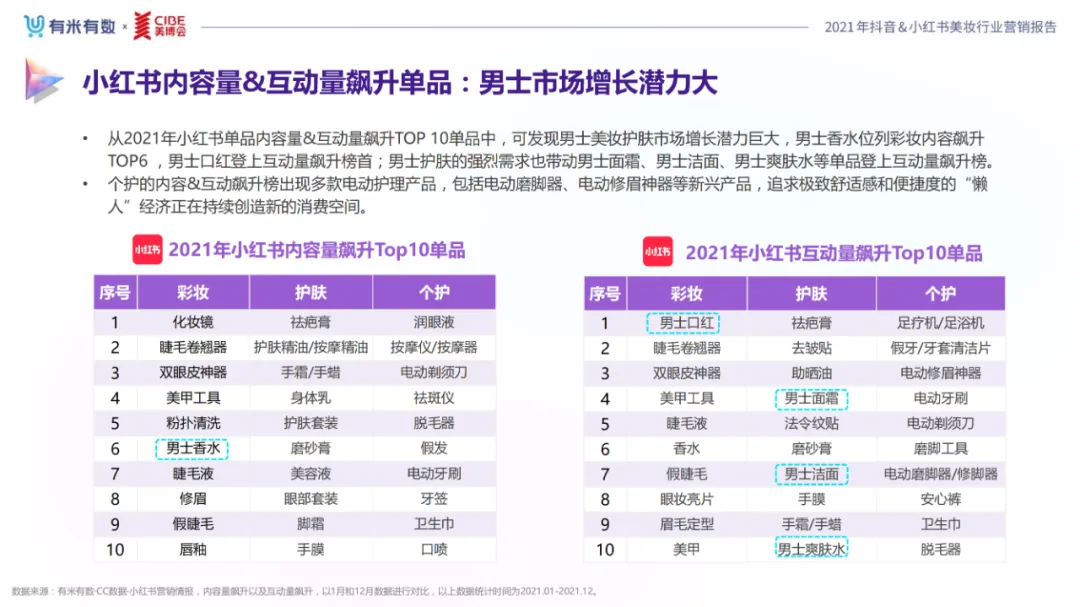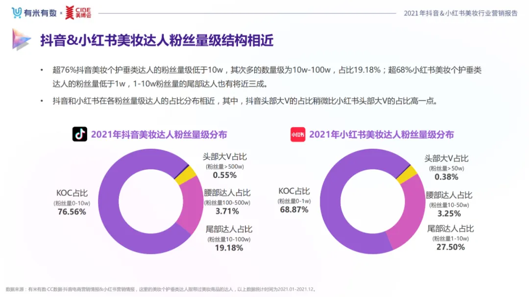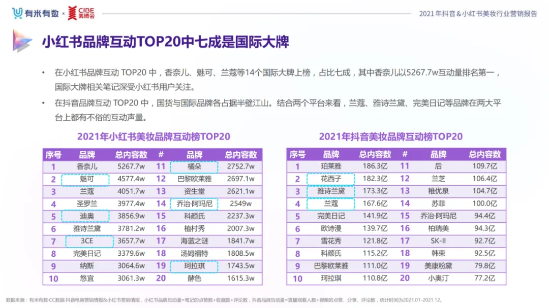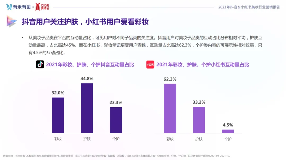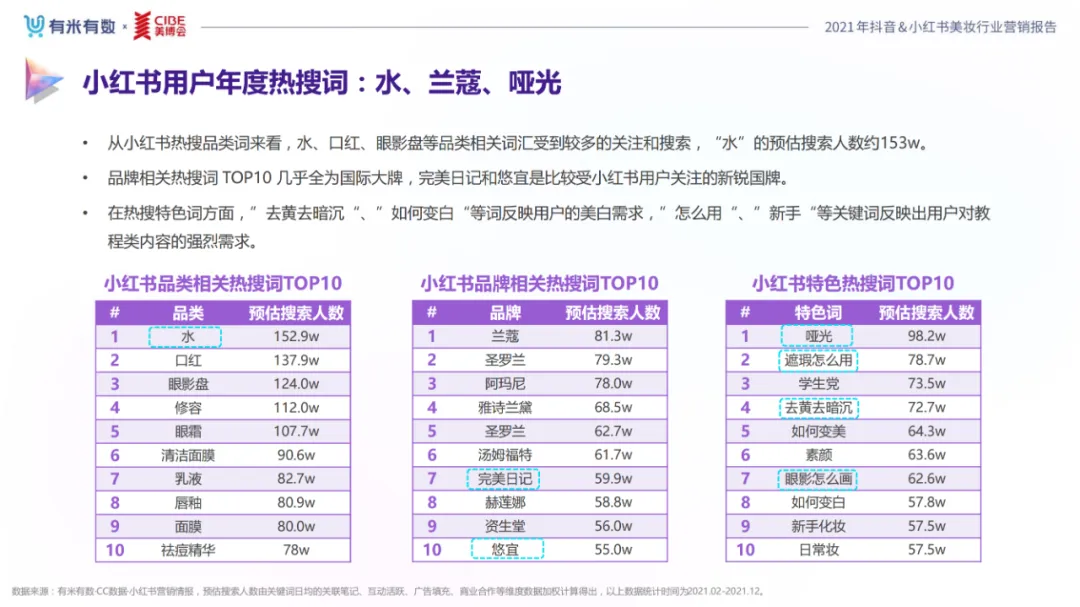 近年,中国美妆行业市场规模稳步上升,增长空间广阔的同时,竞争也愈发激烈,传统国货、国际大牌和新锐国货陷入混战。小红书和抖音是美妆品牌方的社媒营销重阵,在小红书种草后到抖音实现转化成为可行的爆品路径。基于上述背景,有米有数联合中国国际美博会出品《2021抖音&小红书美妆行业营销报告》,利用有米有数旗下产品快选品、CC数据的海量抖音电商以及小红书营销情报,提供行业大盘趋势、热门单品赛道以及内容营销洞察等大数据情报。