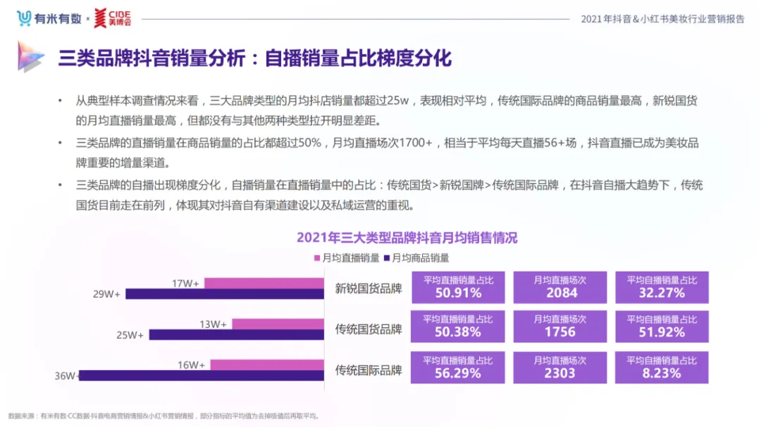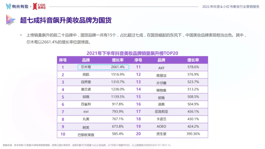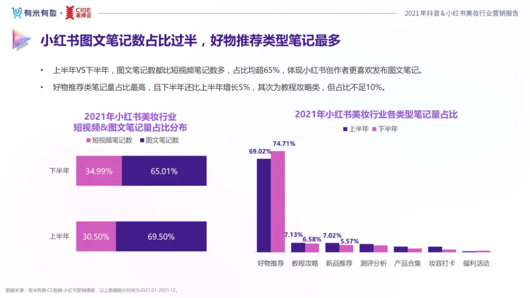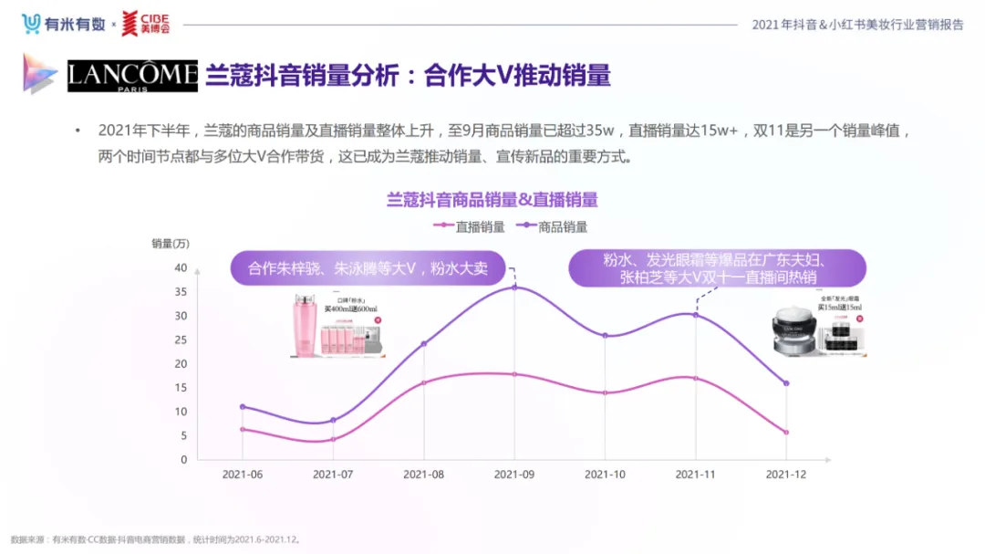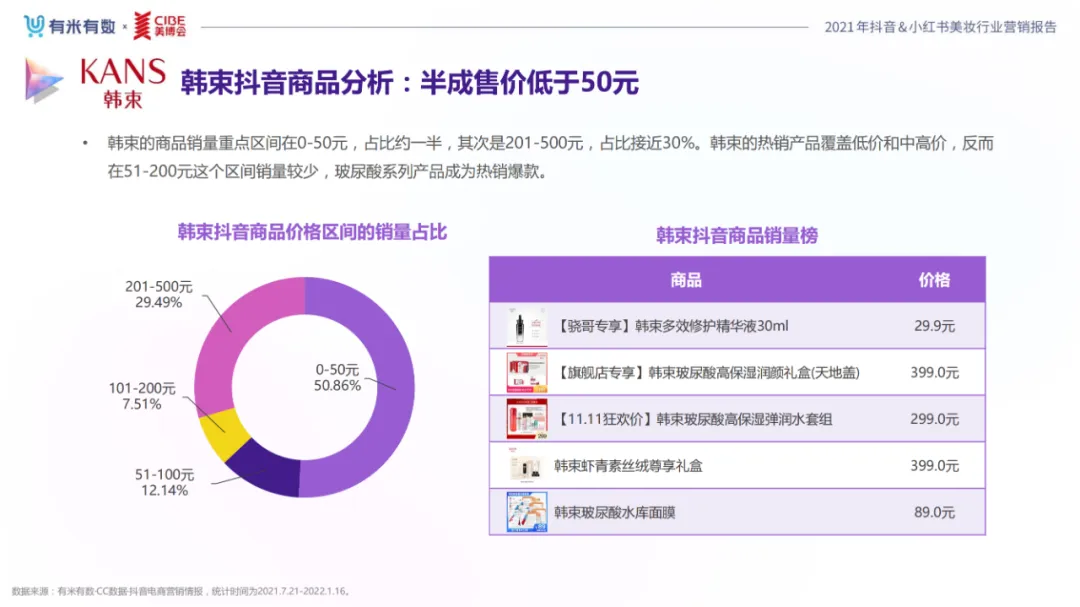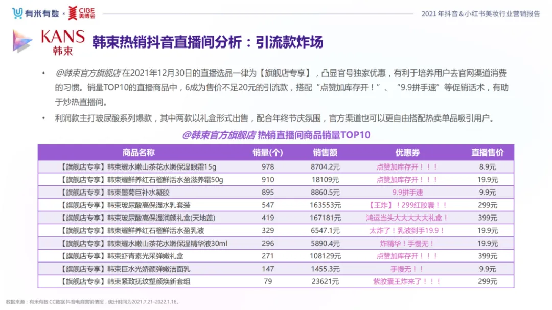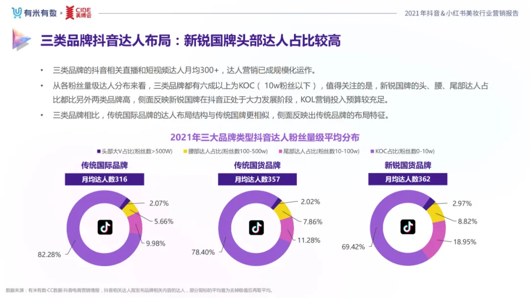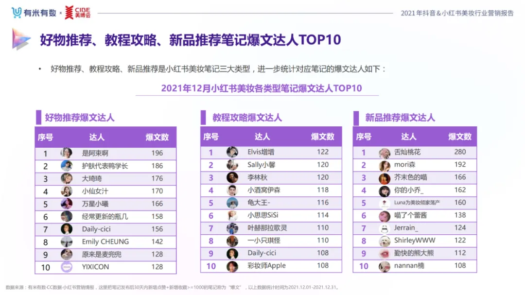 近年,中国美妆行业市场规模稳步上升,增长空间广阔的同时,竞争也愈发激烈,传统国货、国际大牌和新锐国货陷入混战。小红书和抖音是美妆品牌方的社媒营销重阵,在小红书种草后到抖音实现转化成为可行的爆品路径。基于上述背景,有米有数联合中国国际美博会出品《2021抖音&小红书美妆行业营销报告》,利用有米有数旗下产品快选品、CC数据的海量抖音电商以及小红书营销情报,提供行业大盘趋势、热门单品赛道以及内容营销洞察等大数据情报。