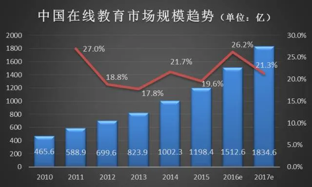 教育一直是国人较关心的市场,自互联网教育发展以来,市场发展速度开始相当客观。2015年中国互联网教育市场规模达到1198.4亿,五年间翻了一番。进入移动互联网时代后,互联网教育行业再次迎来变革,即从PC端到移动端的转移。移动端的发展,标志着互联网教育拥有了更大的覆盖面积和想象空间,也诞生了一大批以主打移动教育的企业,互联网教育市场规模的快速增长由此而来。