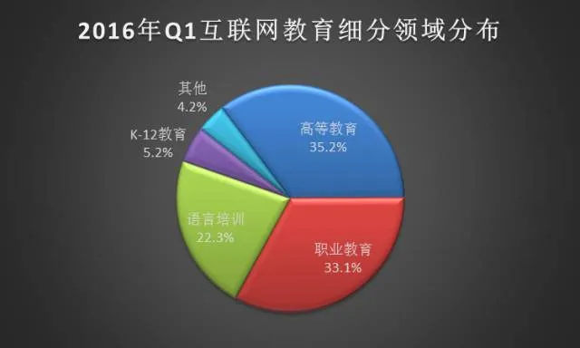 在互联网教育行业的细分领域分布中可以看出,高等教育、职业教育、语言培训类是互联网教育市场当前的主体,分别占比35.2%、33.1%和22.3%,K-12教育在市场中占比5.2%,其他细分领域共占4.2%。而当下三家分晋的格局的原因,是互联网教育还没有发展到成熟阶段。高等教育、职业教育、语言培训等,都属于刚需,也是前期企业布局的主题。而随着用户习惯的逐渐养成,未来基于兴趣学习、早教等多领域的互联网教育模式将快速兴起,市场细分将更加多元。