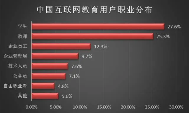 在用户属性上看,互联网教育的主要用户集中在学生和教师上,分别占比27.6%和25.3%,可以看出互联网教育不仅是学生自主提高的工具,更是已经成为教师等教育工作者们的学习工具甚至是教学工具,未来互联网教育必将与传统教育相结合,走入课堂、办公等真正的学习和应用场景,成为各职业、各阶层有效的学习工具。