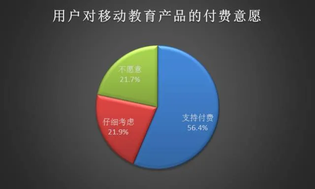在关于用户对移动教育的付费意愿的调查结果上看,和2015年相比用户对移动教育的付费意识有了明显提升,56.4%的用户明确表示支持付费,21.9%的用户表示将仔细考虑,不愿付费的用户占了21.7%,愿意考虑和支持付费的用户较2015年上升了14.1%。一方面是移动互联网的发展致使人们的移动支付习惯逐渐成熟,另一方面也与移动教育企业们的大力推动有关。