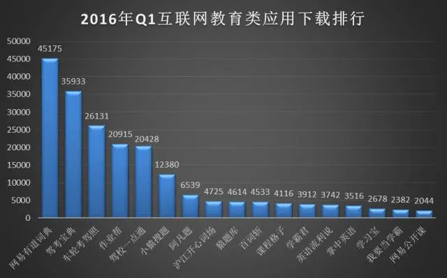 在2016年一季度移动端学习类应用的下载量排行中,可以看出下载量超过2亿的前五名应用都以工具类应用为主,其中网易有道词典下载量达到4.5亿,排名第二、第三和第五的两个应用都是与驾照考试学习相关,作业帮是学生的题库类应用。从下载量靠前的应用中可以看出,题库类、学习工具类的应用普及速度最快,归根结底是日常使用的便捷。这也意味着教育O2O、课程平台类的应用在移动端拥有良好的发展空间,未来移动端或诞生巨头。