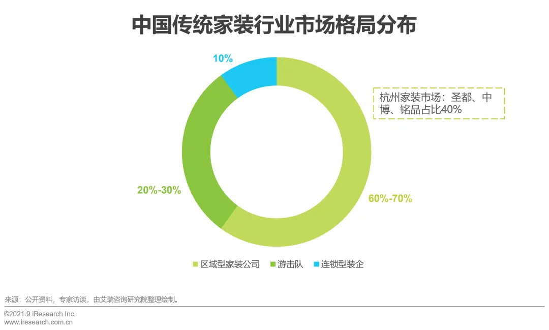 家装包含测量、设计、报价、选材、施工、验收等多个环节,流程工期较长,涉及专业知识多,传统家装普遍存在工期不确定、价格不透明、施工工艺不过关等问题。与此同时,家装行业还存在明显的地域性特征,调研结果表明,全国传统家装市场中区域型玩家渗透率高达60-70%;区域型装企深耕本地市场多年带来了一定市场优势,以杭州市场为例,圣都、中博、铭品三家公司的市场占比达到40%。形成此格局的原因主要在于传统家装市场工程属性重,建材和人工偏向就地取材,对本地公司依赖程度较高。