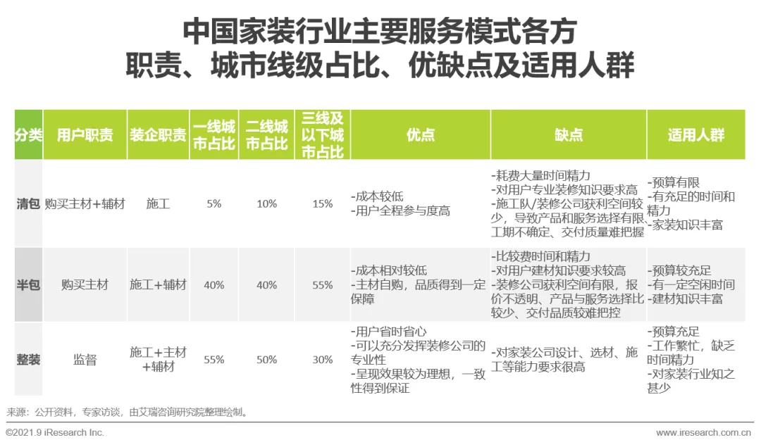 传统家装行业早期服务模式以清包和半包为主,装修公司提供的产品和服务较为单一,施工验收标准也不统一,用户往往需要花费大量时间和心力去和装修队与建材商贩沟通、议价,由于缺乏经验和专业知识最终呈现的效果也往往不够理想。随着当今生活节奏加快,越来越多的用户缺乏时间与精力去多方斡旋;调研结果表明,高线级城市用户更加倾向于使用类似爱空间模式的一站式整装服务,清、半包模式随着城市线级的提升,市场占比出现明显下滑。在用户购买力升级和审美水平不断提升的大趋势之下,传统家装的服务模式已经难以满足多变的需求,艾瑞认为未来标准化、专业化的整装服务会成为大多数用户的首选。