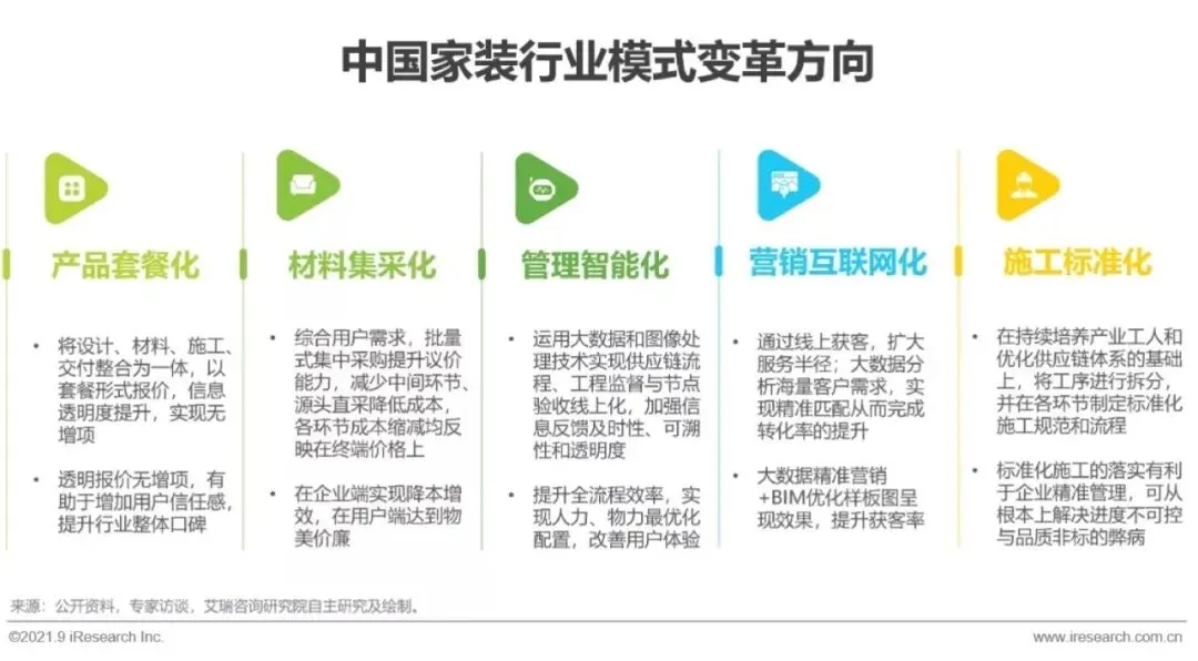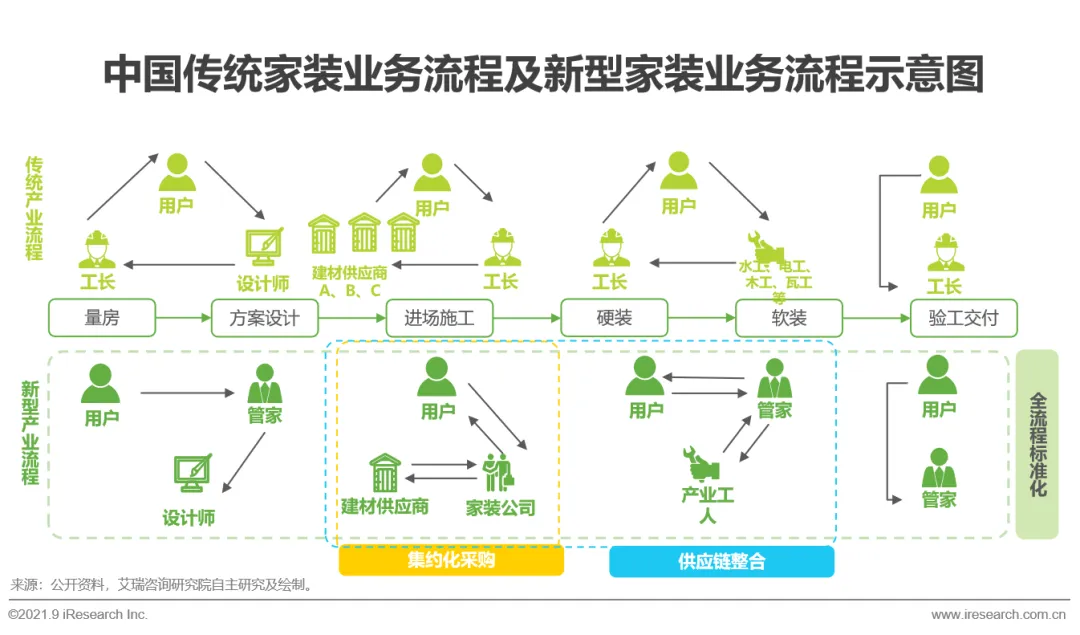 艾瑞调研数据显示,家装消费者中年轻人群占比超过85%,通过需求侧重点分析可以发现,年轻消费者对于设计风格的多样性和定制化需求更高,这说明家已经升级为生活方式的具象化体现。面对越发重视生活品质的客群,传统家装公司逐个满足消费者的个性化需求的运营逻辑,导致其很难实现规模化扩张。个性化趋势下,头部家装企业通过标准化的产品运营思维,将消费者个性化需求进行调研、汇总、分类,集合成具有共性的家装设计模块,配合推、拉式供应链模式,为消费者提供满足理想生活方式的家装解决方案。