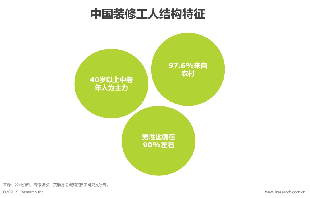 传统的施工团队通常由包工头带领散工组成,专业度和纪律性的匮乏导致了施工效率低下、技术不过关等弊病。行业发展过程中产生了工长制,一定程度上增强了纪律性,保证了基础的交付能力,但施工质量与效率低下的问题仍未得到根本解决。职业化产业工人即经过严格的标准化施工体系培训,并通过信息化系统进行规范化管理的工人。旨在从根本上解决行业服务能力弱和交付品质差的痛点,并且帮助工人在劳有所得、收入得到保障的同时获得用户的认可感和尊重感。从工人结构的角度来看,当下装修工人有中老年人居多、男性占比重、农民工为主的特征,产业工人的普及将有利于调动青壮年劳动力的积极性,均衡工人组织结构,从而实现工艺的传承。然而,产业工人渗透率在2020年仅有10%左右,由于前期投入大,收效时间长,许多企业仅采用工长制。从2014年爱空间布局直管工人模式,到2020年12月,公开资料显示爱空间已实现全国在编产业工人6,806人,入职两年以上人数占比46%,为行业带来正面的带头示范效果,有利于进一步推动产业工人的普及。
