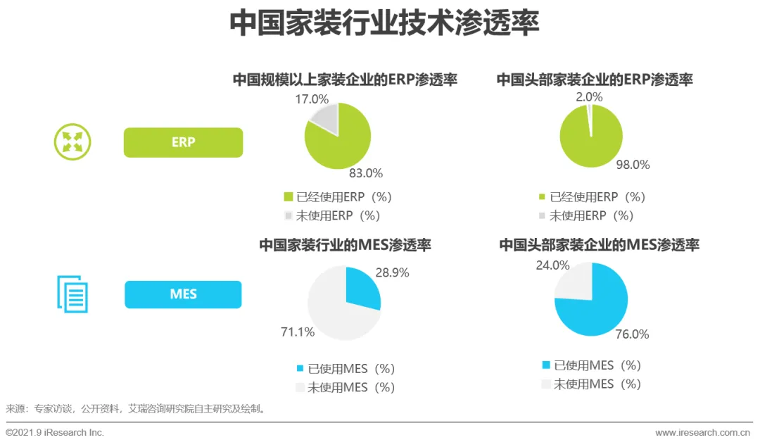 家装需求中存量房改造的需求比例逐步提升,并开始成为行业增长的新动力,且新型消费群体相对具有更强的个人消费意识,其家装需求也更为精细,因此通过数字化技术来提升用户的家装服务体验,解决之前由于人工原因带来的“量房不准、设计时间长”等问题。目前行业头部玩家如爱空间、东易日盛等通过3D设计软件和BIM建模软件来深化自身的设计平台能力,通过ERP等企业资源管理系统来提升内部业务联动速度、提高业务链路效率,通过MES系统来实现设计、采购、施工、验收全业务的管控。家装行业整体数字化程度正在快速提升。