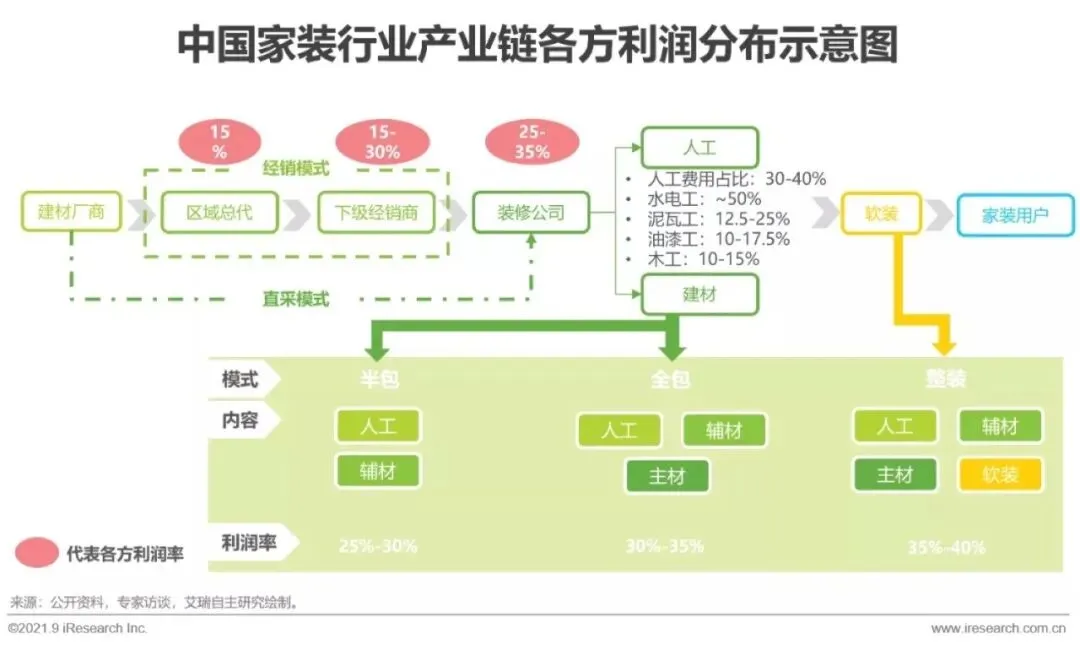 当前,规模化装企普遍采用直采模式来避免代理商和经销商的渠道加价,供应链环节的简化使得下游用户端可减少30-45%的成本。随着人工成本和材料价格的透明度提升,主营硬装的家装企业利润率已经非常固定,整装大家居趋势下,企业只有在产业链路上延伸布局,通过对业务深度的不断挖掘才可获得利润的提升。