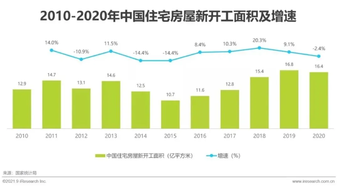 上世纪90年代末我国房改制度全面推行,房地产行业蓬勃发展,2010年至2020年,我国商品房销售面积除2014年相较2013年出现轻微下降,其余年份均同比增长,十年间积累了大量住房库存,同时近三年来我国年均新开工面积维持在16亿平方米上下。持续韧性的地产建设和地产销售对房地产投资起到一定的带动作用,为家装行业奠定了夯实的产值基础。