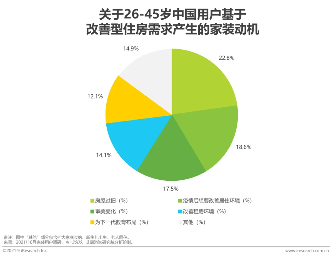以整装头部企业爱空间为例,26-35岁用户占比达到36.7%,36-45岁用户占比达到31.2%,26-45岁用户占比超过65%,80后、90后逐步成为家装市场的重要消费群体。相比于老一辈的消费观念,新消费群体具有较高的品牌意识,对于整体服务的质量要求更高,更加关注家装公司产品的口碑。艾瑞调研发现,基于改善自身住房状况的年轻用户群体(26岁-45岁)占比达到48.3%,其中,房屋过旧(22.8%)、疫情后想要改善居住环境(18.6%)和自身审美变化(17.5%)是前三个主要因素。