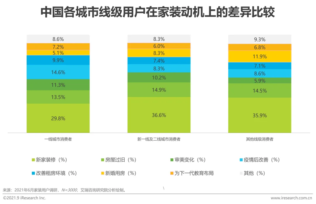 基于艾瑞咨询调研数据,新家装修的家装动机仍然居于家装消费需求产生的主要原因,其占比达到34.2%。但旧房改造(14.6%)、审美变化(10.2%)、扩大家庭收纳(5.4%)等存量房相关的比例已经超过30%,存量房的家装动机逐渐显现。从用户所在城市线级进行比较,出于改善旧房等存量房相关的家装动机的用户在一线城市用户、新一线及二线城市用户、其他线级城市用户的比例依次为65.1%、55.1%和52.2%。不难看出,改善旧有住房的家装动机在高线城市具有更高的渗透率,存量房改造逐步成为一线城市的房屋家装新动能。