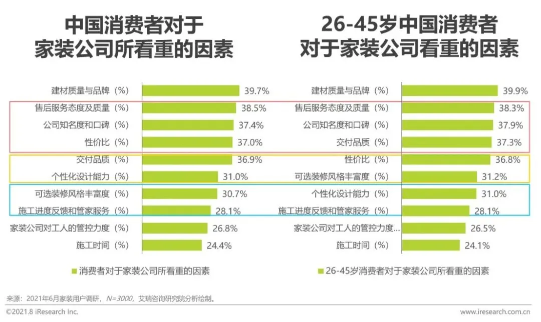 基于艾瑞咨询调研,39.7%的用户关注家装公司所提供的耗材的质量与品牌,38.5%的用户关注售后服务态度及服务质量,关注公司知名度及口碑的用户达到37.4%。而对于性价比的关注因素(占比达到37%)和施工时间(占比达到24.4%)。新家装用户对于价格和时间的需求较弱,更倾向于慢工细活以及整体的装修质量的把控,也更为关注品质和服务。此外,通过比照26-45岁消费群体所看重的因素,该类人群虽同样关注品质、服务和家装企业,但相较于性价比,其更关注交付品质,表明该人群对于生活品质的高追求;且和整体相比,对家装公司可以提供的装修风格的多样性上,该类用户也具有更高的要求。新一代家装用户所关注的方向更加具有个人特色。
