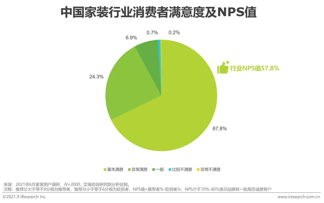 艾瑞调研数据显示,消费者对于家装行业整体较为满意,但感到非常满意的用户仅占24.3%,同时行业NPS值为到57.8%,客户满意度和忠诚度都尚有较大进步空间。用户选择推荐的原因主要集中在专业度高、设计风格多样和省心;而用户评选不推荐的原因主要为交付品质差、施工反馈不及时和售后服务差。黑猫投诉平台数据显示,业之峰、爱空间、东易日盛等垂直型家装企业投诉量明显少于土巴兔、齐家等平台型装修企业;以投诉处理效率来看,行业平均投诉完成率为56.5%,爱空间凭借高效的售后处理机制使投诉完成率高达94.4%。在调研企业中爱空间在验收质量和执行效率指标上分别获得4.29分和4.32分,均大幅超出行业平均水平。对行业痛点问题突出的解决能力使爱空间整体NPS值达到72.7%,在客户端积累了良好的口碑。