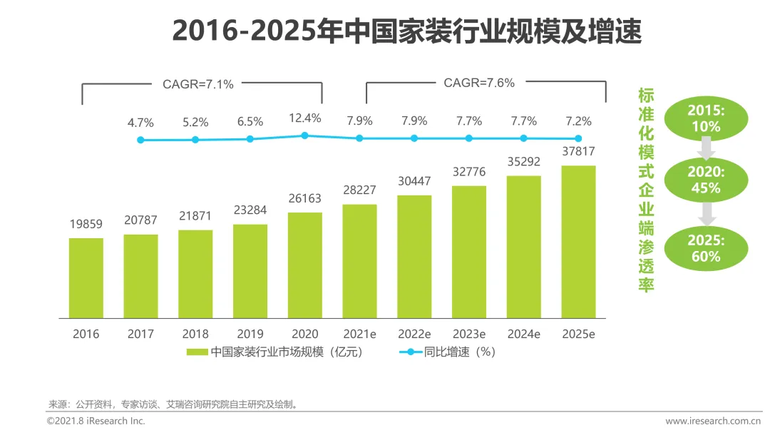 中国家装行业基数大,发展较为稳定,2020年行业市场规模达26,163亿,同比增长12.4%,随着存量需求的不断释放和全装配政策的激励,2025年家装行业市场规模预计将达到37,817亿。自2014年以来,以产品、交付、服务标准化为核心的一站式,运用标准化模式的企业在2015年仅有10%,随着竞争格局加剧于2020年提升至45%,并在2025年有望达到60%,标准化整装市场发展前景广阔。