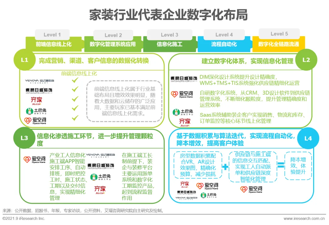家装企业数字化水平可由低到高划分为5个等级,初级前端信息线上化随着技术应用的不断成熟已在行业端普及,艾瑞认为只有当企业数字化能力达到L5水平才从真正实现数据链对业务链的全环节有效赋能。