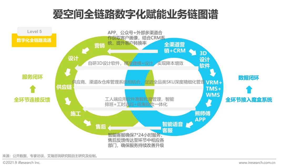 如前文所提,达到L5-数字化全链路流通意味着企业真正做到了数据与服务闭环相结合。爱空间凭借强大的IT团队和大量研发投入,以“点-线-面”的方式不断进行技术升级及改造,在营销、设计、供应链、施工和售后各节点布局数字化产品,并通过自研“魔盒”系统将所有数据环节串联、紧跟业务流程,率先实现数字化对业务链全流程赋能升级。