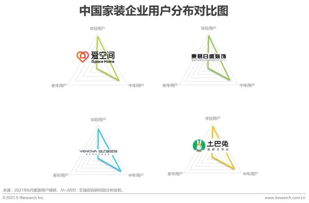 调研数据显示家装行业整体用户群体呈年轻态分布,26-35岁年轻用户占比最高,同时,36-45岁中年用户的家装需求也为行业提供了坚固的收入支撑。代表企业中,东易日盛通过整装子品牌布局,客群中年轻用户占比很高;业之峰与土巴兔则中年用户占比相对较高;爱空间着力布局年轻客群使其用户年轻化趋势明显,同时因品质过硬也受到中年用户的认可。艾瑞认为随着新生代人群消费能力的不断提升,年轻化消费者会成为未来装企提升营收规模的主要驱动因素,对年轻化群体的家装需求的满足将会是未来装企核心竞争力的一项重要考量指标。