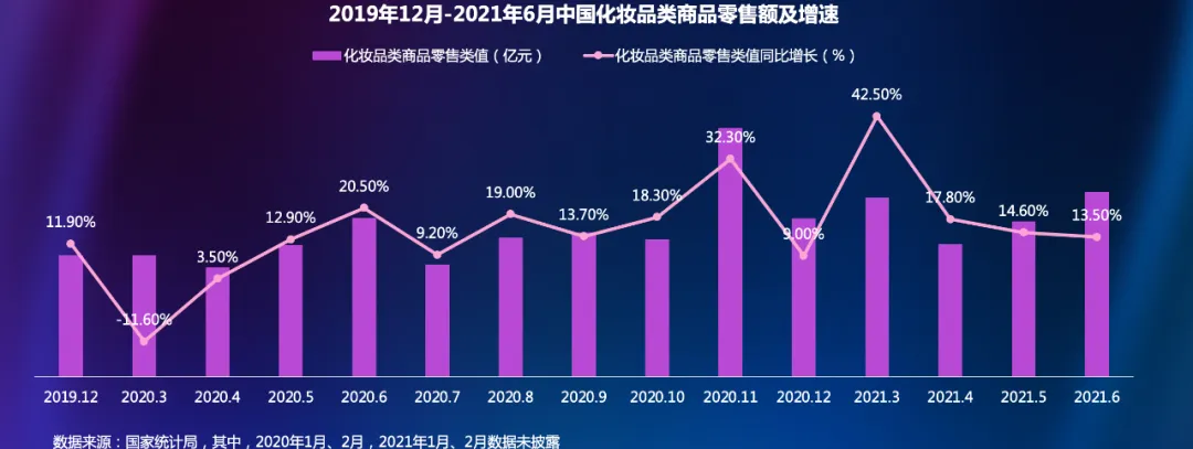化妆品行业市场规模缓慢上升 2021年二季度,中国化妆品市场规模增速出现明显下降,增长幅度放缓,但化妆品销售额仍为增长。国家统计局数据显示,化妆品类商品零售额同比增长从一季度末的42.5%下降到二季度末的13.5%,化妆品行业商品零售额则从272.2亿元增长至379.3亿元,维持上涨。受双十一和女神节大促的强势拉动,2020年11月和2021年3月化妆品零售额均有明显增长。6月,国家药监局发布了《化妆品标签管理办法》,明确了化妆品的标签化管理和标签的细化要求;公开征求《儿童化妆品监督管理规定(征求意见稿)》意见,规范儿童化妆品生产经营活动,保障儿童用妆安全。一系列政策的发布,既保障了消费者用妆安全,同时,促进化妆品行业高质量发展。
