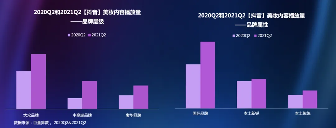 更多国际品牌进军抖音开拓市场 大众品牌以其亲民价格、与大牌比肩的功效和不断研发的新型添加成分以及高性价比受到用户的广泛关注,小奥汀黑胶唱片眼影盘等网红爆款成为当季热推商品,凭借其真实良好的用户体验圈粉无数。国产品牌日益突起,如薇诺娜3月成功IPO并专注敏感肌护理成为美妆板块新龙头;花西子、colorkey珂拉琪等平价国货加大大促节点短视频营销;国际品牌也通过抖音打入本土市场,二季度国际品牌美妆内容播放量同比增长最为显著。