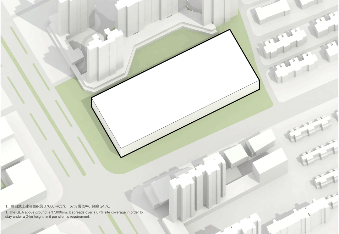 1. The GFA above ground is 37,000sqm. It spreads over a 67% site coverage in order to stay under a 24m height limit per client's requirement.