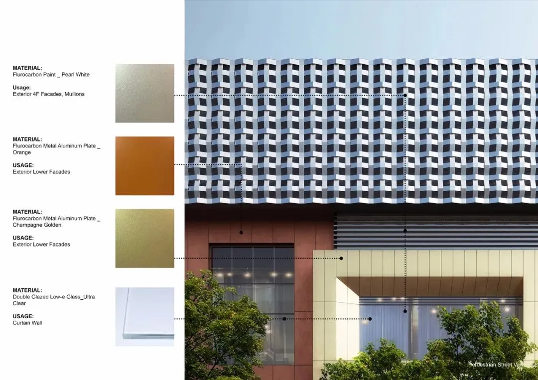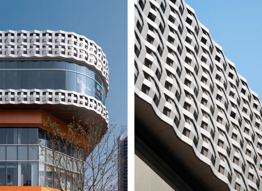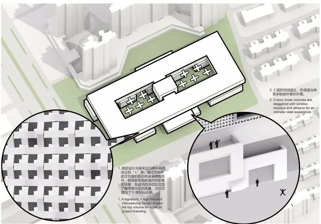 表皮设计灵感来自品牌中具有标志的“+”号,我们以预制好的正负编织的白色金属模数为组件,现场安装组成强烈的的表皮语言,在建筑的高位处以一个完整的界面营造了雕塑感十足的体量,为项目增加了个性和标志感。在晚上结合灯光的变化,整体效果在白天和晚上呈现不同的氛围。