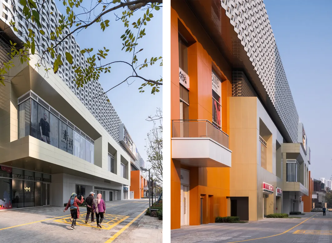 世茂52+其整体造型以简洁、个性、实用为主。设计手法在低度空间利用了叠加的小尺度盒子,打破了单一体量的沉闷和生硬,立面采用浅暖灰、橙色与银灰色的金属板组织成不同尺度的叠加盒子,从而达到宜人有温度的尺寸。设计师希望建筑体量与周边环境尺度融洽、可接近性,实现“家”的延伸空间的初衷。