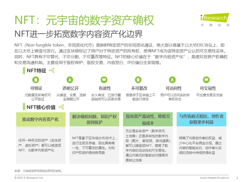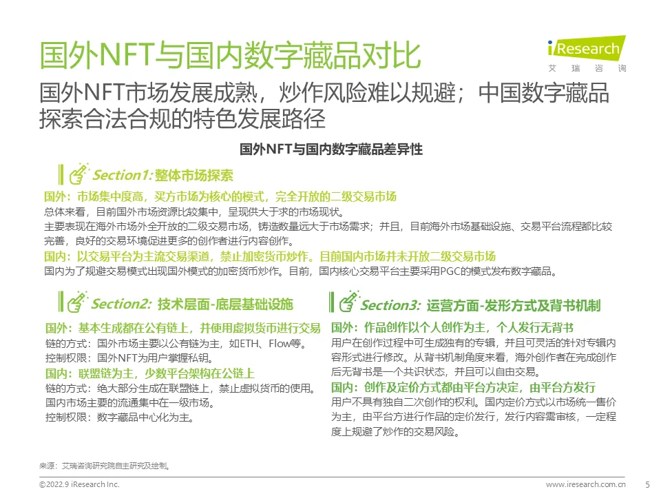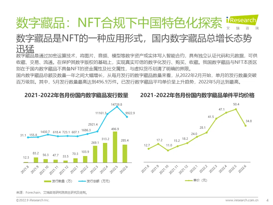 •数字藏品是NFT的一种应用形式,两者都具有不可篡改、不可分割、唯一性等特征,同时,两者最大的差异性表现在数字藏品不具备NFT的金融属性及社交属性;