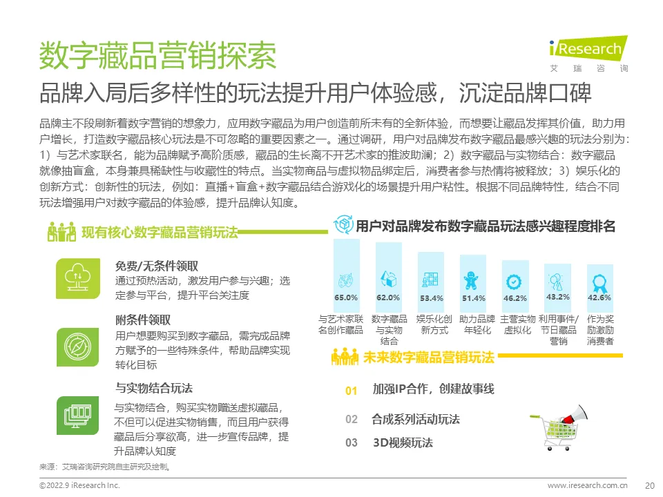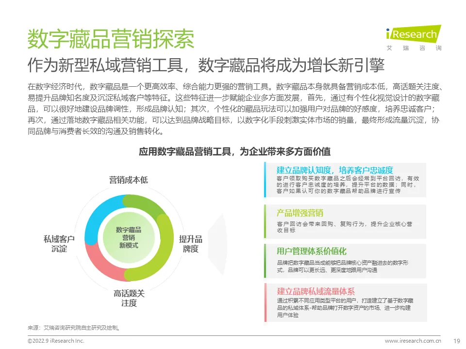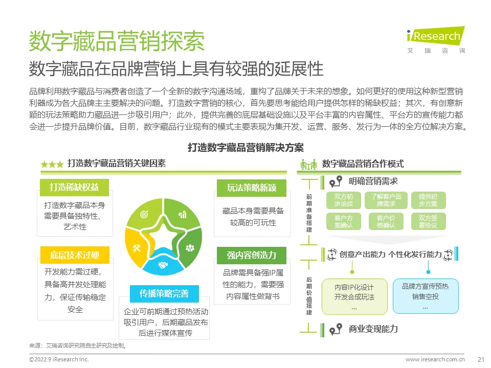 •当企业进入数字化转型的新时代,数字藏品营销将成为数字营销新模式,助力品牌可持续化发展;通过打造个性化的数字藏品营销解决方案及独特的藏品玩法,增强用户粘性,提升品牌价值;